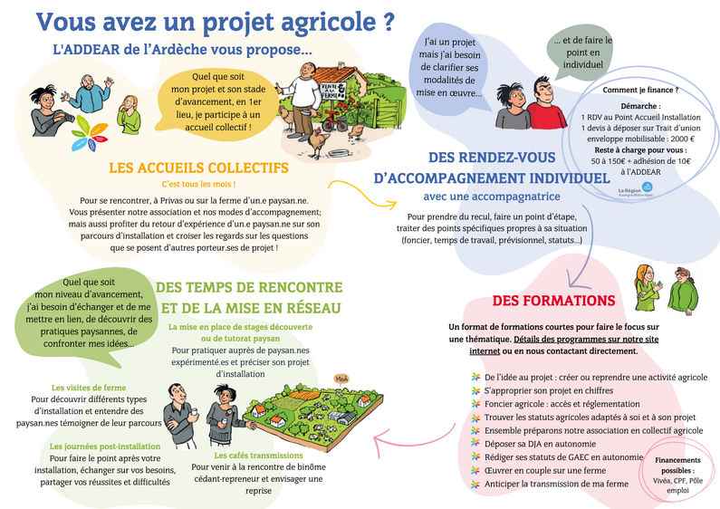 Pour des installations individuelles ou collectives, de l’émergence du projet jusqu’à sa formalisation : regard extérieur et conseils sur votre projet, mises à disposition d’outils économiques et juridiques, mise en réseau, aide à la prise de décision, stages pratiques, appui au dépôt de demandes de financement...