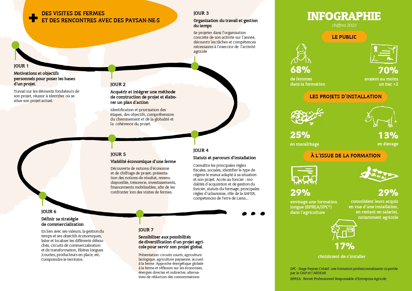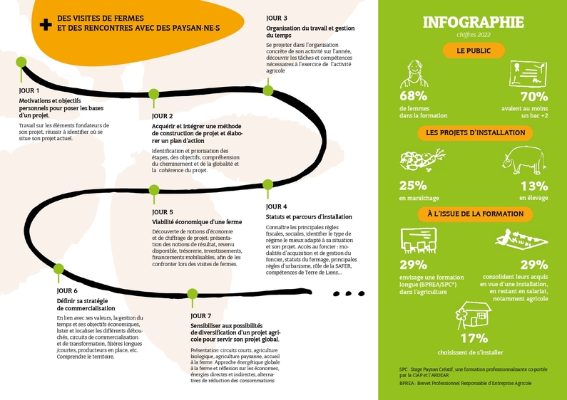 💡Un dispositif d’accompagnement collectif de cinq journées réparties sur deux mois pour affiner son projet agricole en se posant les bonnes questions grâce à des visites de ferme, des témoignages de paysan·ne·s, des travaux de groupe.