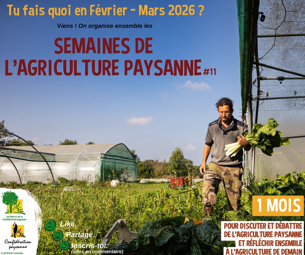 Bonjour le réseau, De mi-février à mi-mars 2026 se dérouleront sur toute la France, les Semaines de l'Agriculture Paysanne #11 (S.A.P.) pour parler d'agriculture paysanne et des sujets qui lui sont liés. Au travers de multiples événements. Par des assos de jeunes en formation avec des paysan·ne...