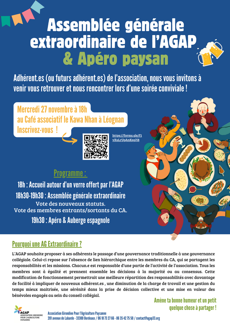 Celle-ci sera l’occasion de vous retrouver et de nous rencontrer autour d’un apéro partagé et de réaliser une Assemblée générale extraordinaire. Cette dernière a pour objet la proposition de nouveaux statuts et, à travers eux, d’un passage de l’association en fonctionnement collégial.