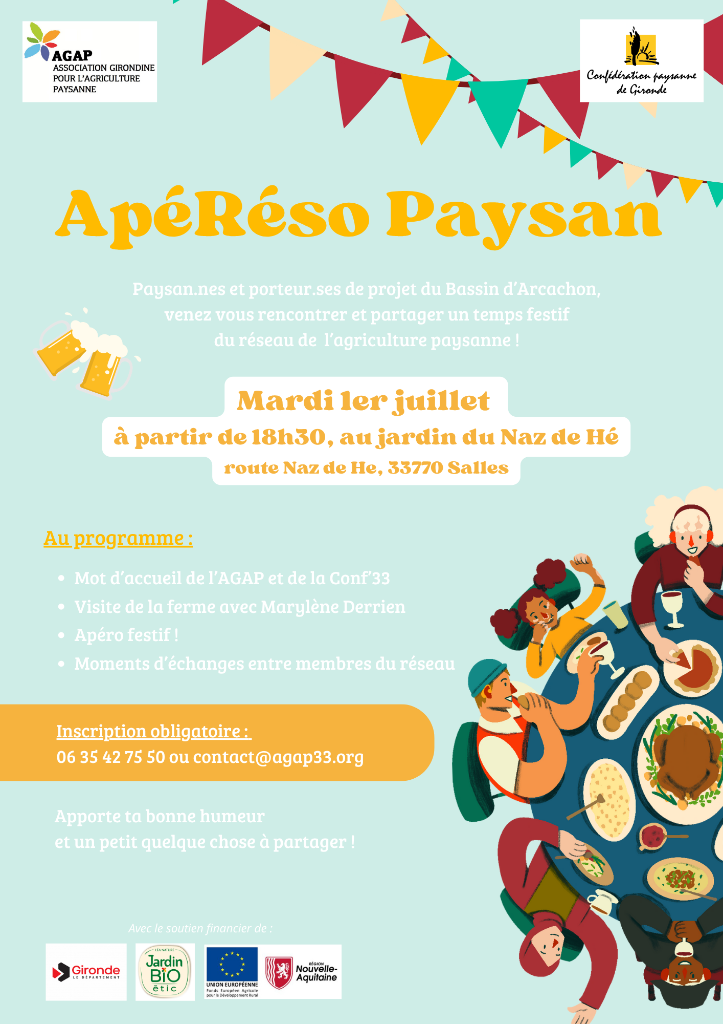 L’AGAP et la Confédération Paysanne ont le plaisir de t’inviter à un Apéréso paysan le mardi 1er juillet à partir de 18h30, dans le cadre bucolique du jardin du Naz de Hé à Salles (33770).