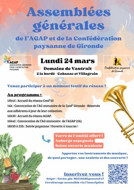 La soirée se poursuivra par un temps festif, partagé avec le réseau de la Confédération paysanne de Gironde. Au programme : verre de l’amitié (offert par l’AGAP et la Conf’), suivi d’un repas partagé sous forme d’auberge espagnole ainsi que d’une scène ouverte musicale où chacun.e pourra venir jouer de son instrument préféré en solo, duo et plus si affinités !