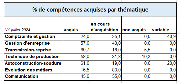 – Pour chaque formation nous réalisons une évaluation des acquis par le formateur. Sur la saison de formation de septembre 2023 à mai 2024, en moyenne sur l’ensemble des formations : 47 % des compétences ont été acquises, 41 % sont en cours d’acquisition, 2 % sont non acquises et 9 % sont variables selon les participants :