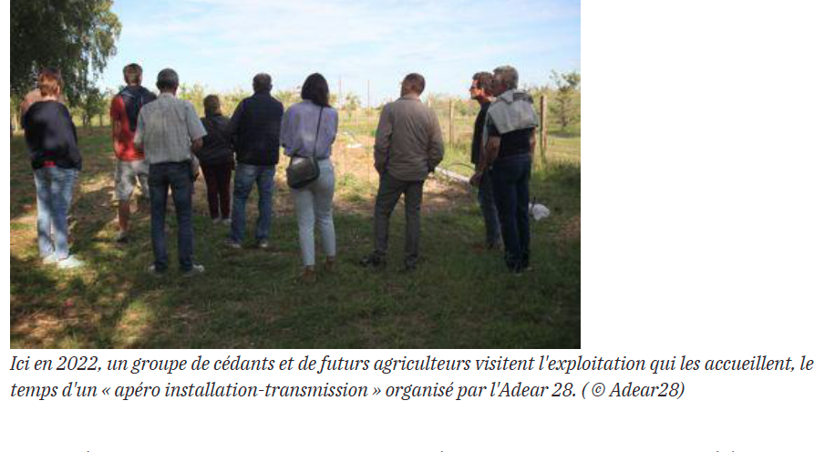 « L’objectif est de briser la glace, de créer du lien. » Ninon Kratchkovsky, animatrice de l’association pour le développement de l’emploi agricole et rural de l’Eure-et-Loir (Adear 28), coordonne des apéritifs entre porteurs de projet et cédants pour discuter d’installation et de transmission. Le plus souvent organisés dans des fermes, ces moments de partage entre agricultrices et agriculteurs du territoire ont déjà fait leurs preuves.