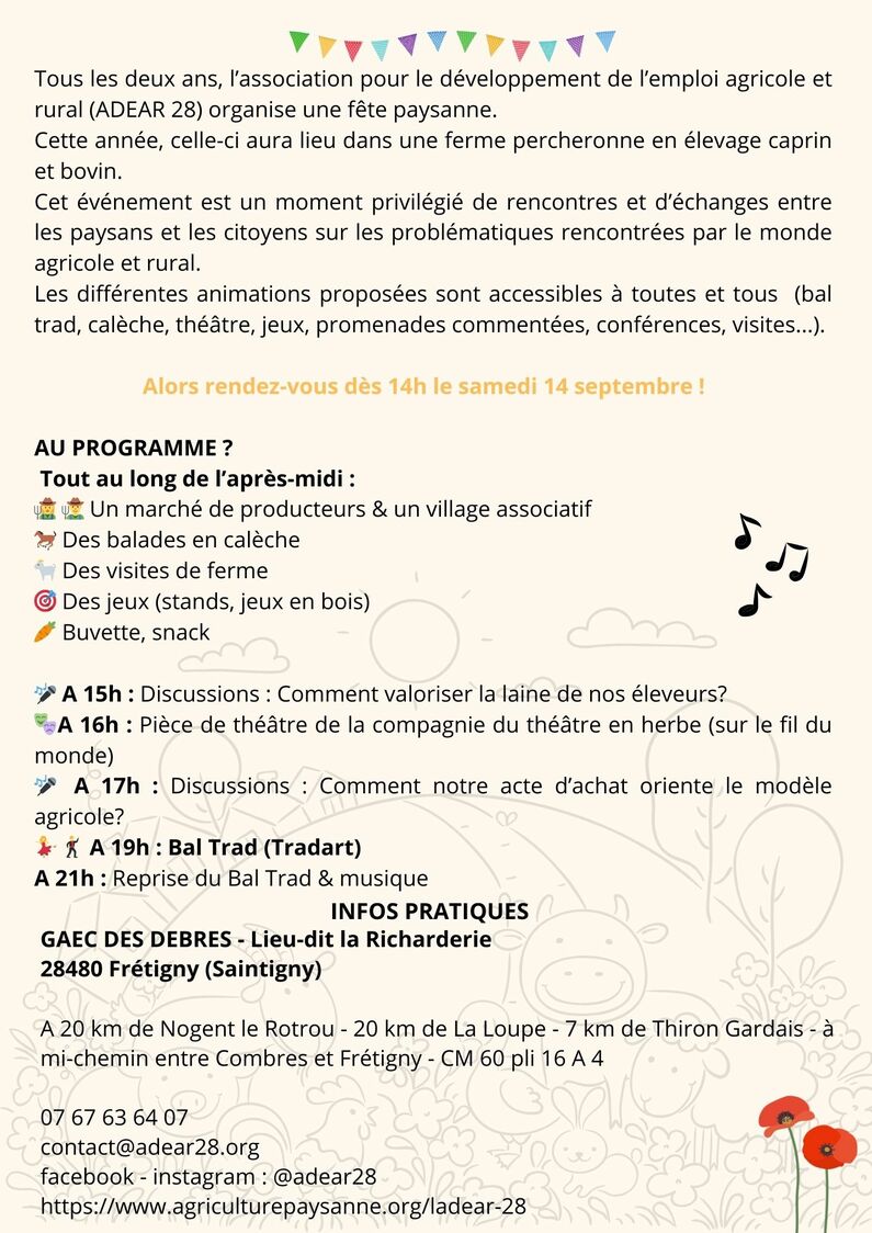 Tous les deux ans, l’ADEAR 28 organise la Fête Paysanne. Cette année, cet événement festif et convivial aura lieu le samedi 14 septembre chez Olivia et Jérémy Derbecq, éleveurs de chèvres au lieu-dit la Richarderie à Frétigny (Saintigny) de 14h à 23h.