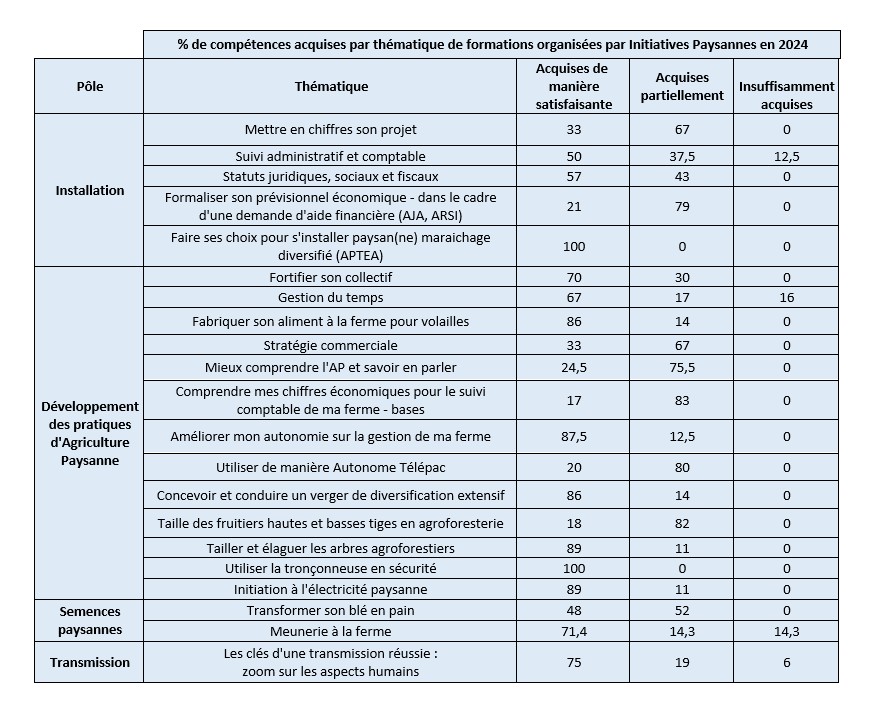 Initiatives Paysannes recueille à l’issue de chaque formation la satisfaction globale des personnes formées. Le taux de satisfaction des stagiaires en 2024 est de 89% (188 exprimés). Ce taux sera mis à jour en avril 2026.