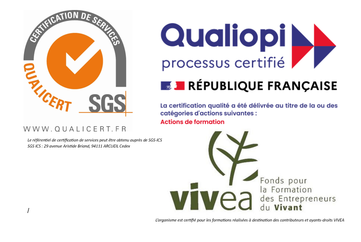 L’organisme est certifié pour les formations réalisées à destination des contributeurs et ayant-droits VIVEA. Pour plus d’info : [ici : https://www.sgs.com/fr-fr/showcases/la-certification-de-services-qualicert]