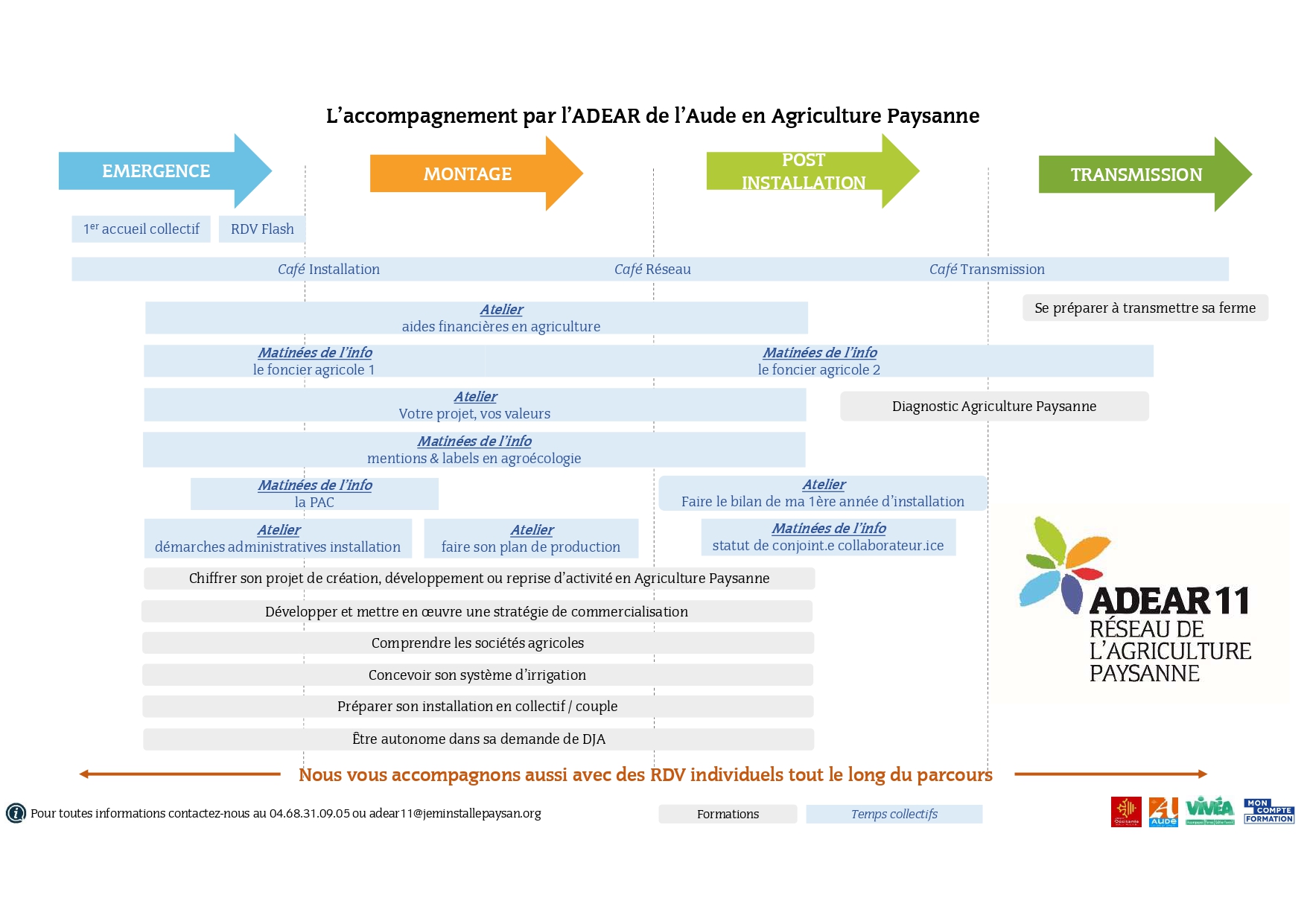 L’ADEAR de l’Aude propose un parcours d’accompagnement individualisé, depuis l’émergence du projet à sa concrétisation. Un suivi est également possible durant les premières années suivant la création de l’entreprise. Certaines thématiques sont abordées sous le format collectif, afin d’encourager le partage d’expériences entre pairs et la connaissance des membres du réseau de l’ADEAR.
