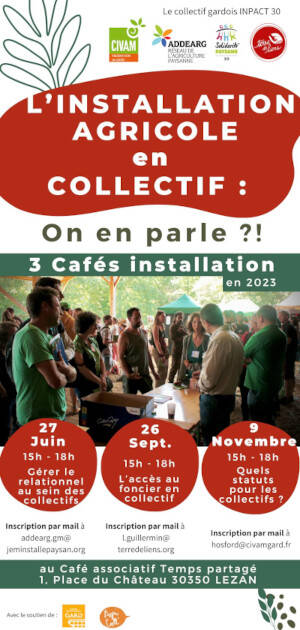 Le collectif gardois InPACT 30 (Addearg, FD Civam 30, Terre de liens et Solidarité paysans) vous propose, dans la continuité du projet régional Agri-Coll consacré à l’installation agricole en collectif, de nous retrouver pour échanger sur les questions de l’accès au foncier en collectif.