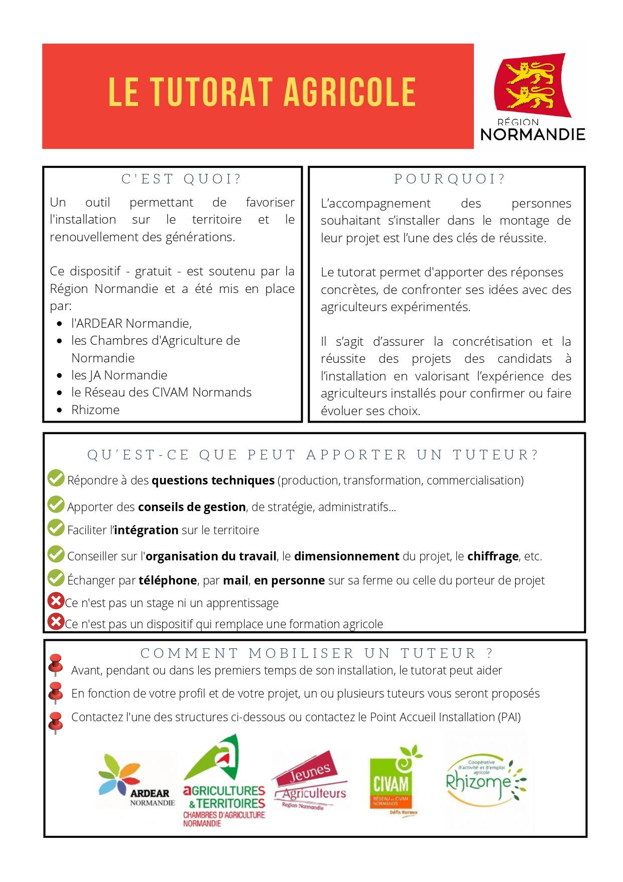 Afin de favoriser l’installation sur le territoire et le renouvellement des agriculteurs, le Conseil Régional de Normandie soutient la mise en place d’un réseau de tuteurs. Il s’agit d’assurer la concrétisation et la réussite des projets des candidats à l’installation en valorisant l’expérience et l’expertise des agriculteurs installés.