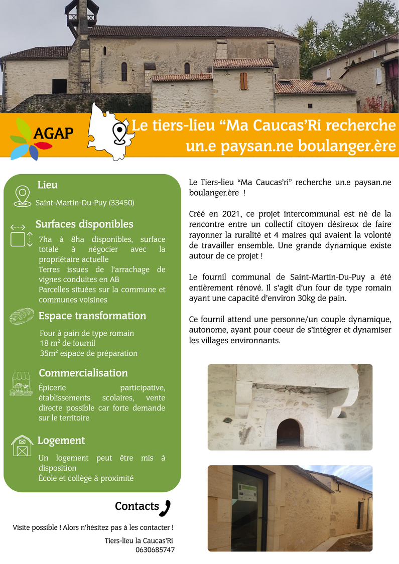 Le Tiers-lieu “Ma Caucas’ri” recherche un.e paysan.ne boulanger.ère ! Créé en 2021, ce projet intercommunal est né de la rencontre entre un collectif citoyen désireux de faire rayonner la ruralité et 4 maires qui avaient la volonté de travailler ensemble. Une grande dynamique existe autour de ce projet !
