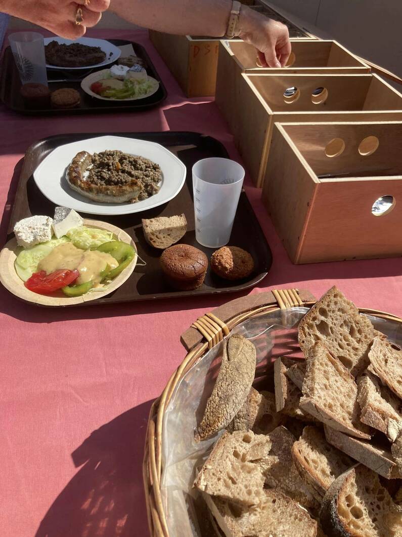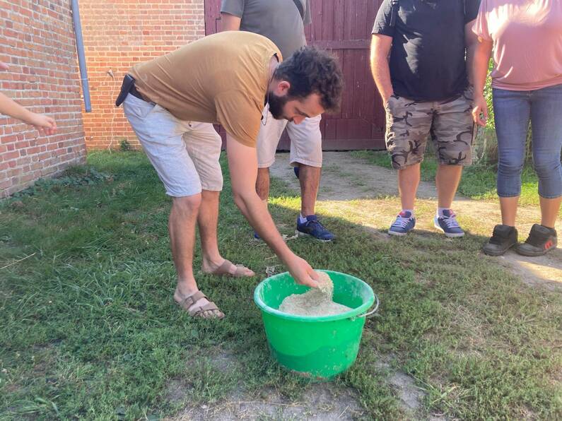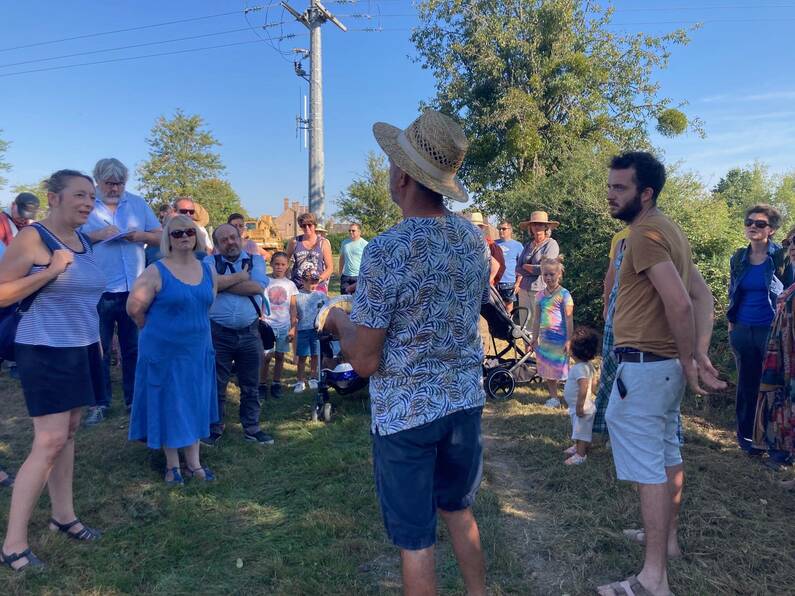 Deux visites de ferme étaient prévues en cette journée de fortes chaleurs. Vaches et cochons étaient dans les prés à l’ombre. L’occasion pour Baptiste et Philippe Prognon (père et fils) de faire découvrir leur quotidien au public venu en nombre soutenir les fermes à tailles humaines. Philippe prend la parole pour débuter l’explication "62 ha ne sont qu’en prairie, ils sont soit pâturés ou fauchés en foin pour l’hiver pour nourrir le troupeau de vaches Limousines qui sont au nombre de 30, le restant est en céréales (10 ha) (...) cela ne sert qu’à l’alimentation des porcs", il poursuit " les veaux sont vendus à la ferme en caissette, j’ai choisi les vaches limousines car c’est une vache rustique qui s’adapte bien à notre région et qui vêle facilement ».