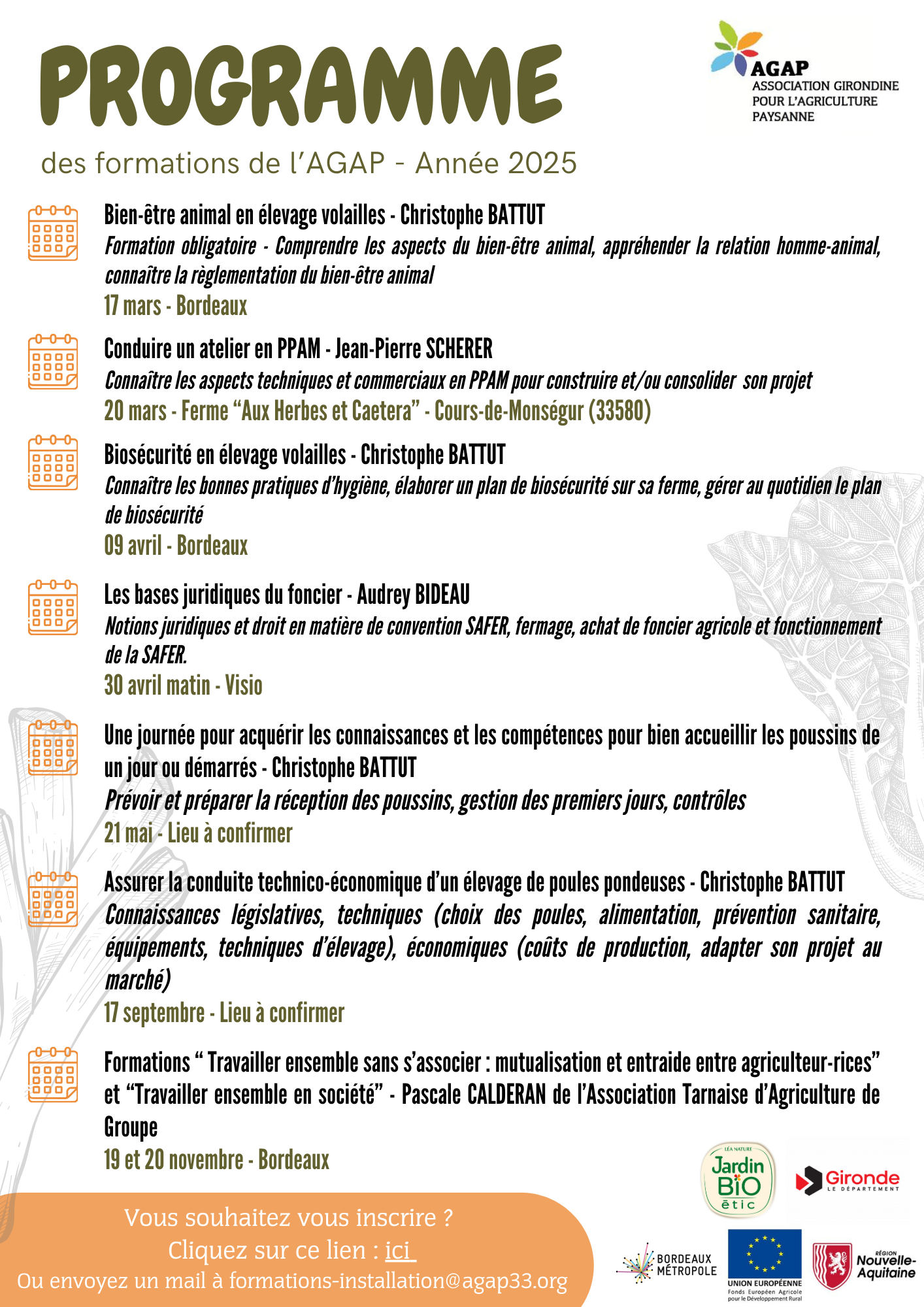 Voici le programme de formations 2025 ! Si vous êtes intéressé-e et que vous souhaitez vous inscrire, merci de cliquer ici : Sinon, vous pouvez aussi envoyer un mail à formations-installation@agap33.org !