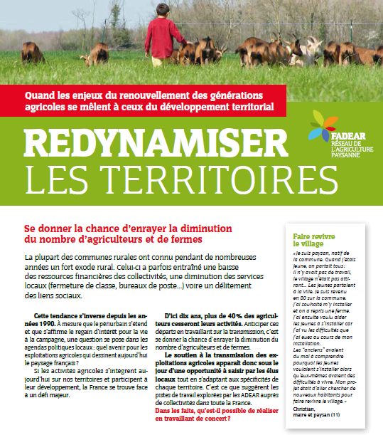 Cette brochure de 10 pages balaye les enjeux du renouvellement des actifs agricoles dans les campagnes. Destinée aux collectivités territoriales, elle résume les liens entre les transmissions agricoles et les enjeux de développement territorial (préservation de l’emploi, des liens sociaux, de filières courtes, d’un patrimoine naturel), les moyens d’actions et les possibilités de partenariat avec les ADEAR pour relever ces défis !