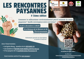 Le jeudi 4 décembre à 18h30 à la Maison de la Nature et de l’Environnement (Bordeaux), L’AGAP réunit paysan.nes et citoyen.nes pour une rencontre autour du sujet : Comment le militantisme environnemental peut-il soutenir la cause paysanne ? Quelle convergence entre nos luttes ?