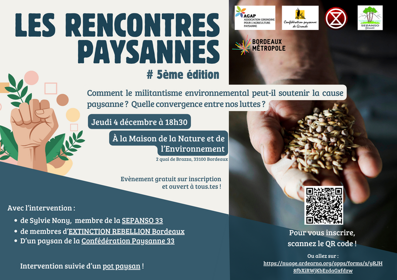 Des membres de la SEPANSO 33 et de Extinction Rebellion Bordeaux interviendront pour l’occasion, ainsi qu’un paysan de la Confédération Paysanne de Gironde. La rencontre sera suivie d’un pot paysan offert !