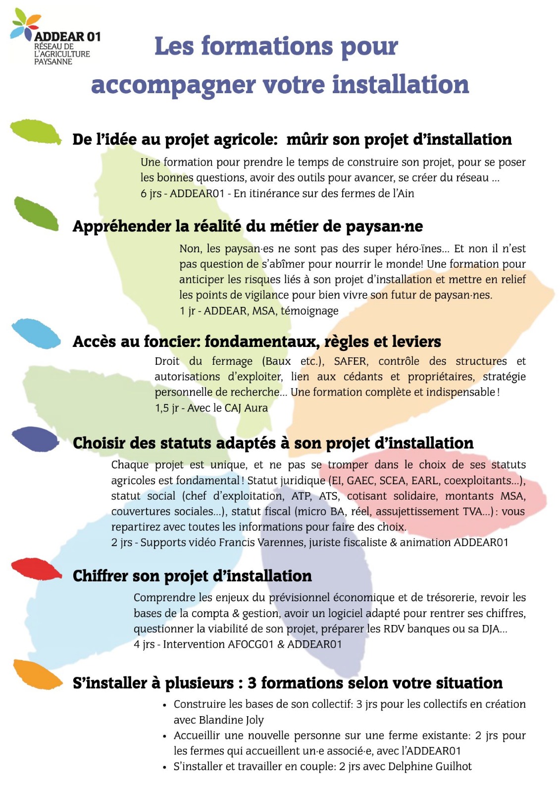 – Des formations spécifiques en lien avec le parcours à l’installation (voir liste détaillée ci-dessous), formations qui permettent de répondre à toutes les questions que vous vous posez, en étant en lien avec d’autres personnes permettant ainsi un partage d’expériences riche et constructif. Qu’elles soient inscrites ou non dans votre PPP, nous vous invitons à participer à toutes les formations qui concernent votre projet, pour être sur·e de prendre les bonnes décisions…