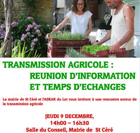Dans le cadre du programme national Accompagnement à l’Installation et à la la Transmission Agricole, l’ADEAR du Lot a engagé un travail avec la commune de St Céré pour sensibiliser les agriculteurs et les agricultrices de la commune, proches de la retraite, à transmettre leur ferme et les informer des démarches et de l’accompagnement existant.