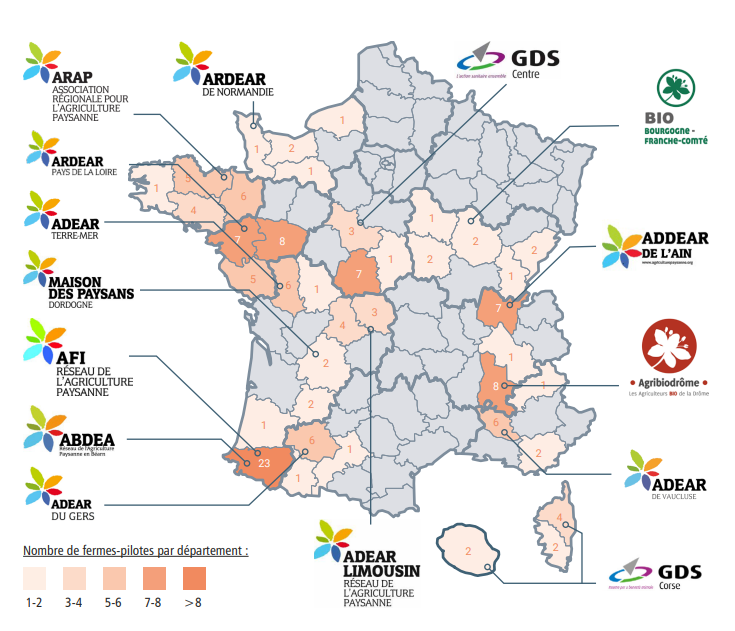 Forte de son réseau et de son expérience dans la gestion de projet multi-partenariale, la FADEAR pilote ce projet depuis son lancement. Grâce à la mobilisation du réseau, plus de 200 fermes avaient soumis leur candidature et 144 ont pu finalement être sélectionnées (92 en volaille et 52 en porc). Localement, ce sont quinze structures locales qui assurent la coordination de ce projet, dont 11 membres du réseau FADEAR.