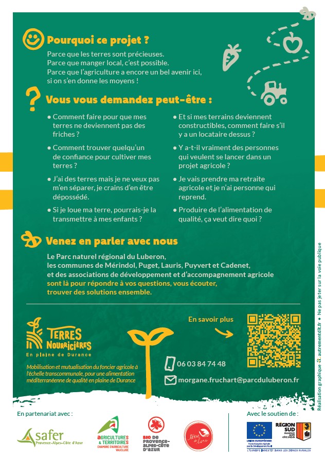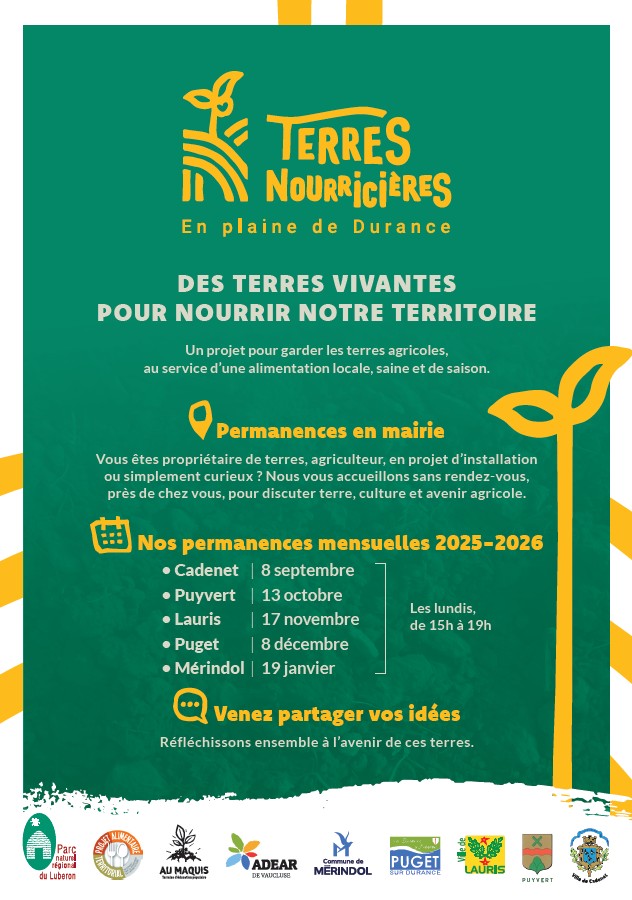 Le Parc naturel régional du Luberon, les communes de Mérindol, Puget, Lauris, Puyvert et Cadenet, et des associations de développement et d’accompagnement agricole sont là pour répondre à vos questions, vous écouter, trouver des solutions ensemble.