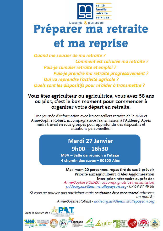 L’Addearg vous invite le 27 janvier, à une journée d’information co-organisée avec les conseillers de la MSA et avec Anne-Sophie Robast, accompagnatrice Transmission à l’Addearg pour le groupe de travail Transmission-reprise du PAT d’Alès Agglomération.