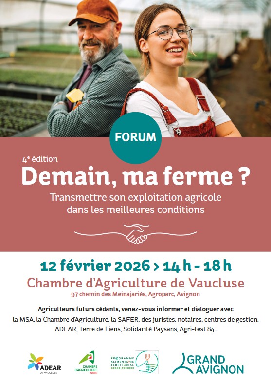 La 4ème édition du Forum Transmission du Grand Avignon « Demain, ma ferme ? » à destination des agriculteurs et futurs cédants aura lieu le 12 février 2025 de 14h à 18h à la chambre d’agriculture du Vaucluse, 97 Chemin des Meinajariès à Avignon, co-organisé par le Grand Avignon, l’ADEAR 84 et la Chambre d’Agriculture de Vaucluse.