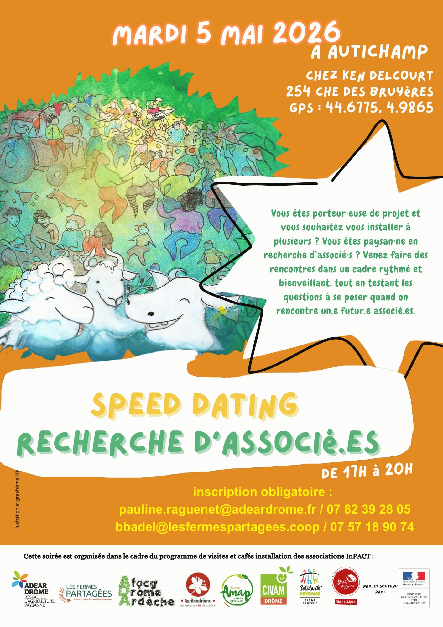 L'Adear et Fermes Partagées organisent le mardi 5 mai à Autichamp un speed-dating "recherche d'associé.es".