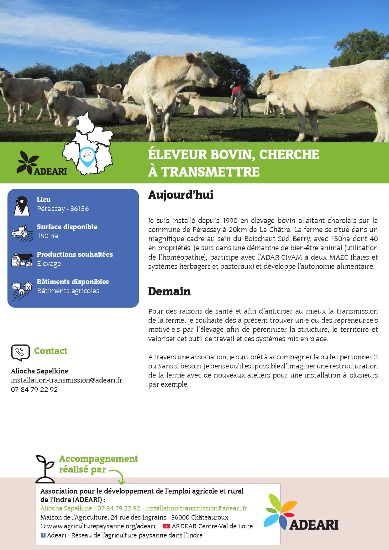 Je suis installé depuis 1990 en élevage bovin allaitant charolais sur la commune de Pérassay à 20km de La Châtre. La ferme se situe dans un magnifique cadre au sein du Boischaut Sud Berry, avec 150ha dont 40 en propriétés. Je suis dans une démarche de bien-être animal (utilisation de l’homéopathie),...