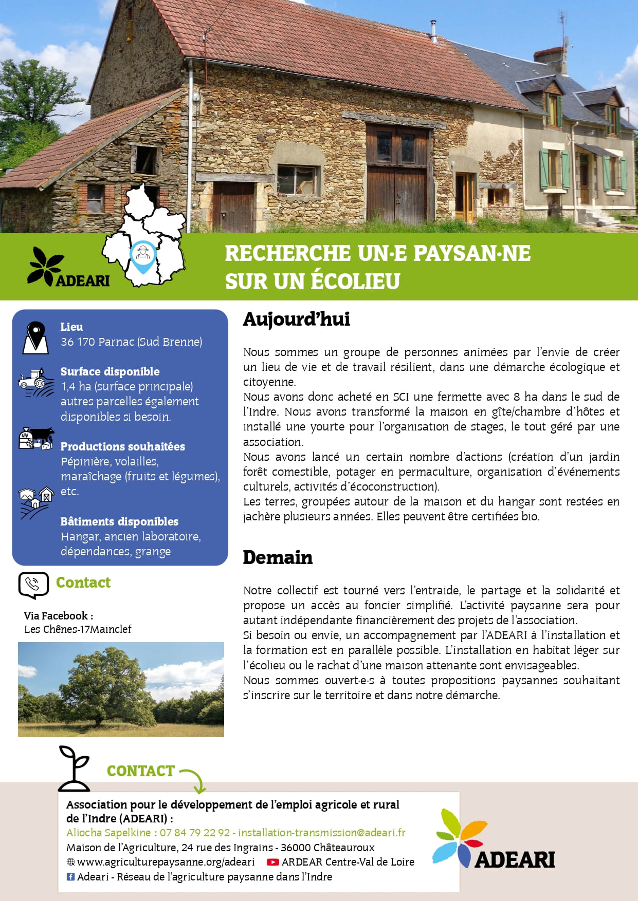 Nous sommes un groupe de personnes animées par l’envie de créer un lieu de vie et de travail résilient, dans une démarche écologique et citoyenne. Nous avons donc acheté en SCI une fermette avec 8 ha dans le sud de l’Indre. Nous avons transformé la maison en gîte/chambre d’hôtes et installé une...