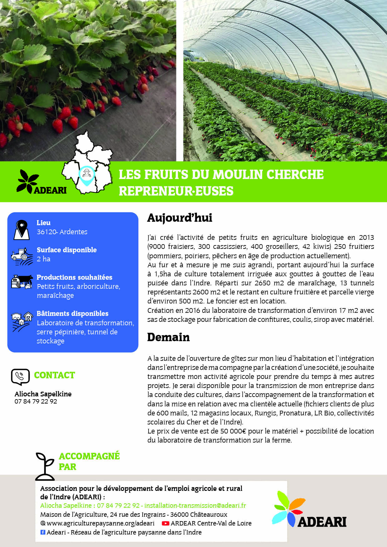 Surface disponible : 2 ha Productions souhaitées : Petits fruits, arboriculture, maraîchage Bâtiments disponibles : Laboratoire de transformation,serre pépinière, tunnel de stockage Aujourd’hui J’ai créé l’activité de petits fruits en agriculture biologique en 2013 (9000 fraisiers, 300 cass...