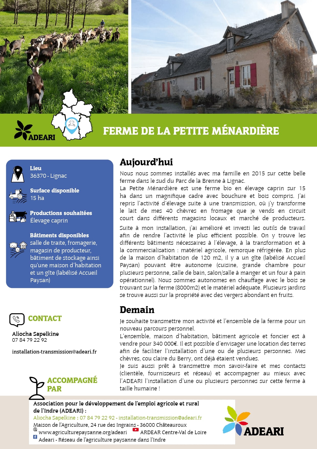 Nous nous sommes installés avec ma famille en 2015 sur cette belle ferme dans le sud du Parc de la Brenne à Lignac. La Petite Ménardière est une ferme bio en élevage caprin sur 15 ha dans un magnifique cadre avec bouchure et bois compris. J’ai repris l’activité d’élevage suite à une transmission,...