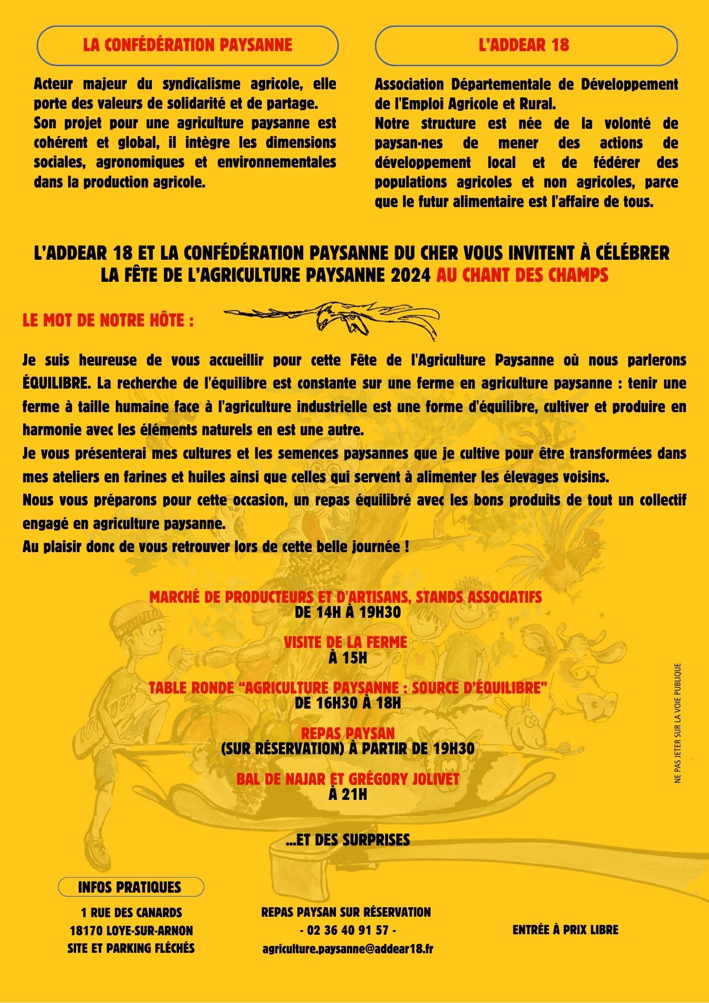 Cette fête - organisée par l'ADDEAR 18 et la Confédération paysanne du Cher - a lieu tous les ans sur une ferme différente pour mettre à l'honneur l'AGRICUTURE PAYSANNE !