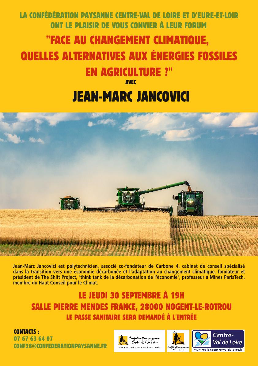 En vue de renforcer la transition agricole en cours, la Confédération Paysanne Centre-Val de Loire et d’Eure et Loir on choisit d’inviter Jean-Marc Jancovici polytechnicien, associé co-fondateur de Carbone 4, cabinet de conseil spécialisé dans la transition vers une économie décarbonée et l’adaptation au changement climatique, fondateur et président de The Shift Project, "think tank de la décarbonation de l’économie", professeur à Mines ParisTech, membre du Haut Conseil pour le Climat.