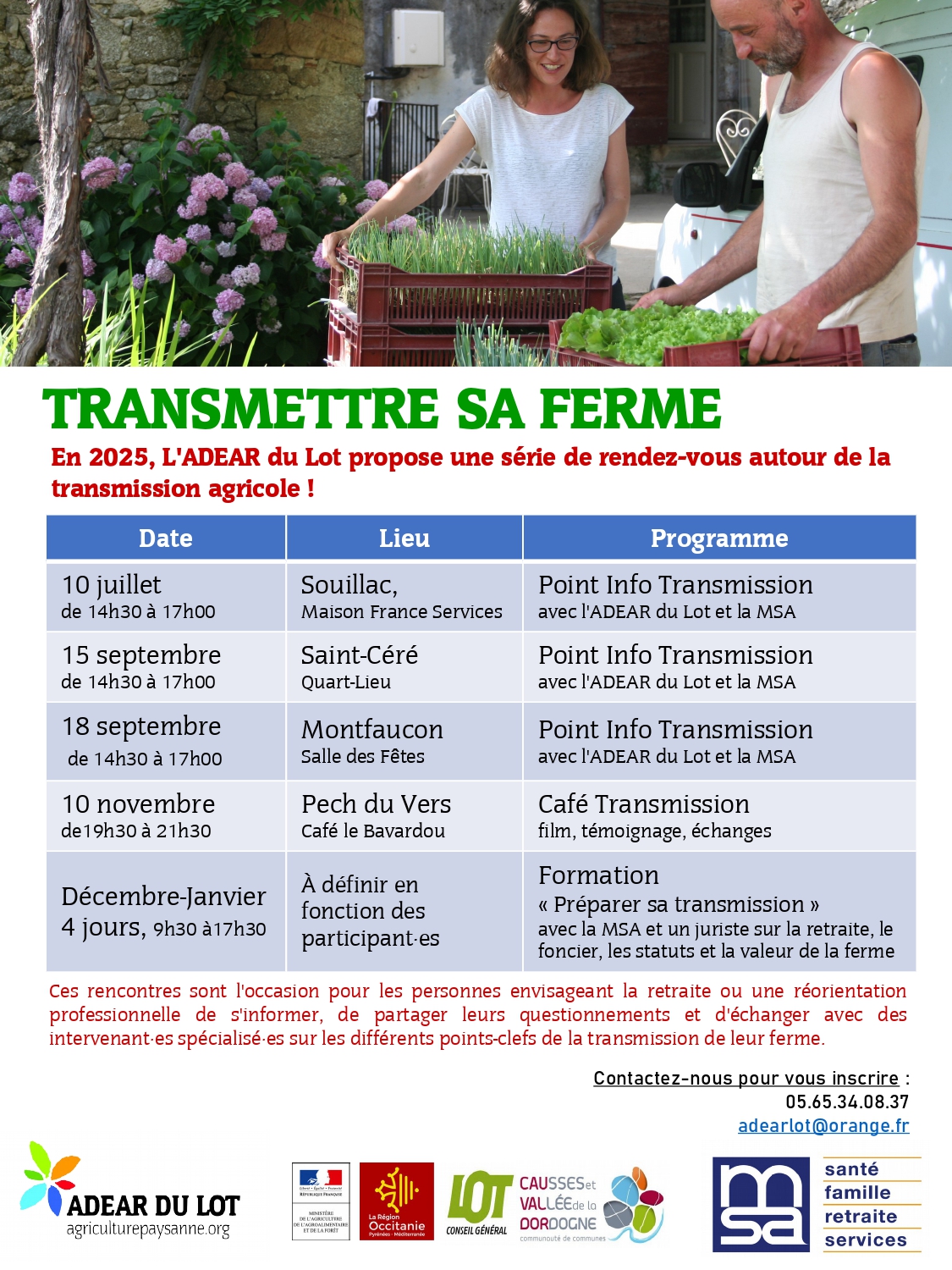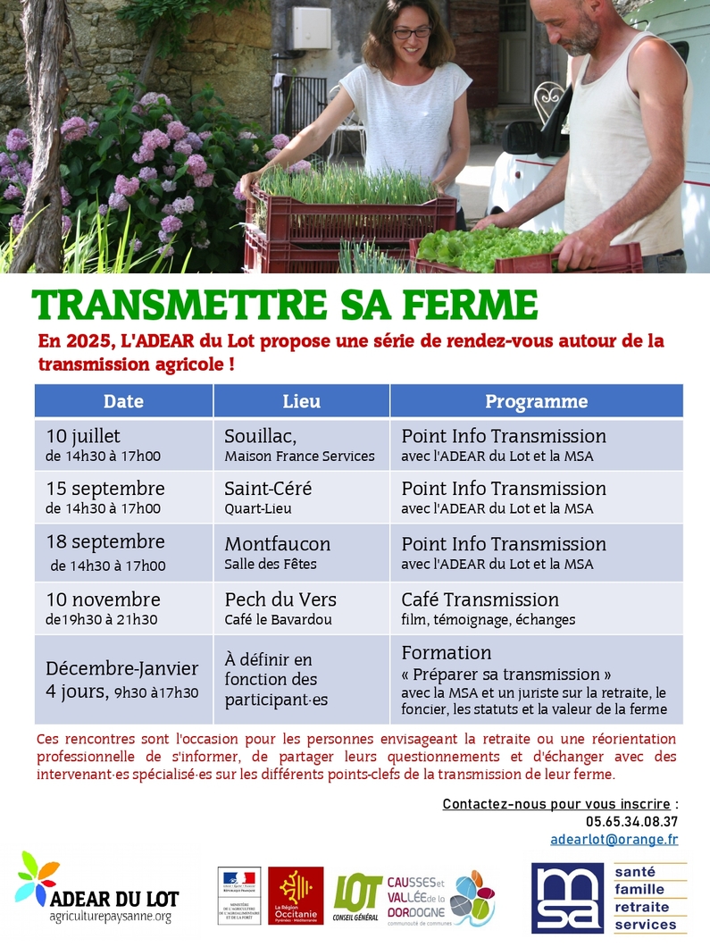 En 2025, l’ADEAR du Lot vous propose une série de rdv autour de la transmission agricole.
